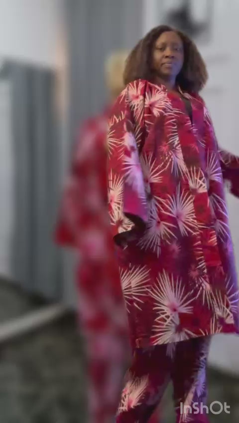 This African print two-piece set features a full-sleeve belt coat paired with floor-length cargo pants, expertly crafted from vibrant Ankara wax print fabric. Designed as an Afropolitan alternative to the traditional Western skirt suit, it offers a bold yet polished look suitable for formal occasions. The patchwork detailing adds unique texture and cultural richness, while the tailored fit and full-length pants ensure elegance and confidence in any setting. Perfect for those looking to blend heritage with contemporary style.